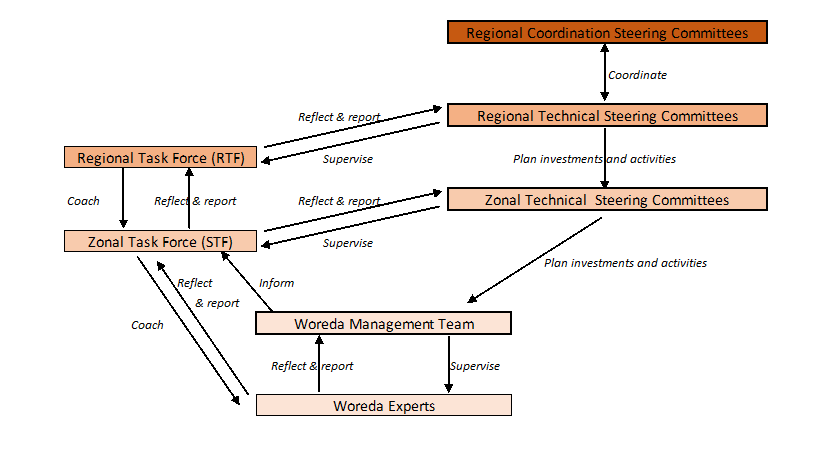 A detailed description of the composition and specific responsibilities of each Steering Committee at Region, Zone and Woreda (Woreda Management Team) levels is provided in the Annexes (Annex GOV1 – A1).