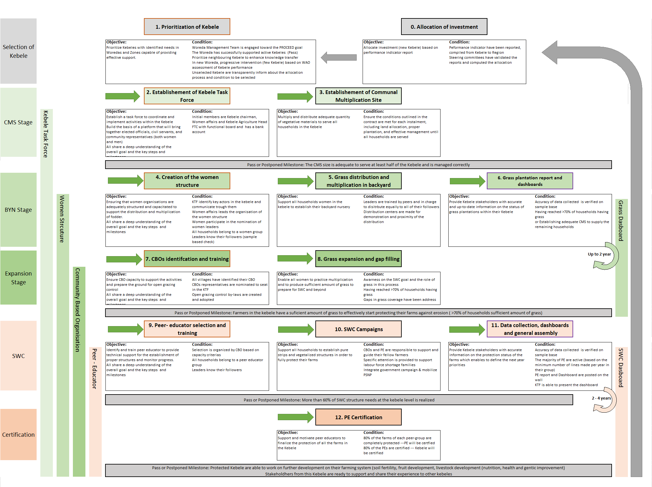 Within each main phase, the operation itself (production of fodder grass or establishment of anti-erosive structures) is preceded by an organisational step (establishment of the Kebele Task Force, creation of women structures, identification and training Community-Based Organisations, selection and training of peer-educators) and followed by a monitoring step (data collection, dashboards and General Assemblies).
