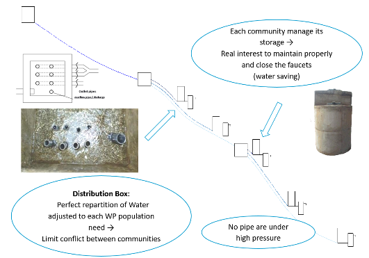 Install an over flow pipe 5 to 10 cm above the supply pipe. This measure protects the spring catchment in the event of unexpected high flow during the rainy seasons or a blockage of supply pipe. Meuli, Spring Catchment, SKAT 2001, 5.2.4, p34
