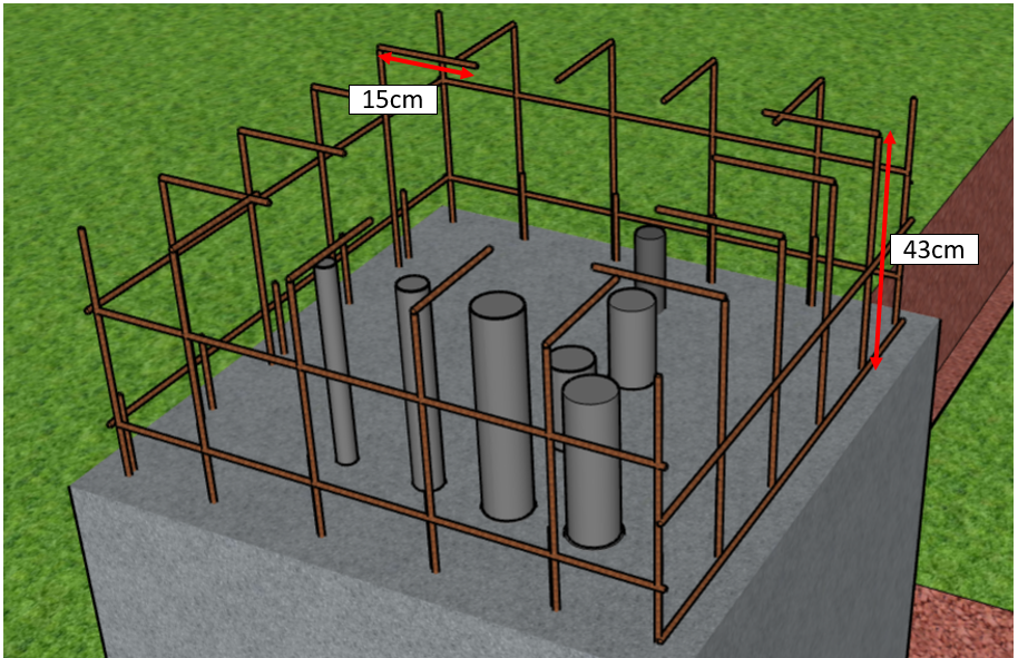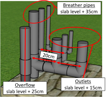 All pipes must be installed on the ground to ensure a good protection at the end of the construction. Only the washout can be installed higher (30cm) to avoid installing a long line to the spillage point if the natural slope is not high enough. All PVC pipes must be 40 cm higher than the top of the masonry to allow for casting of the bottom slab.