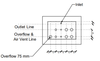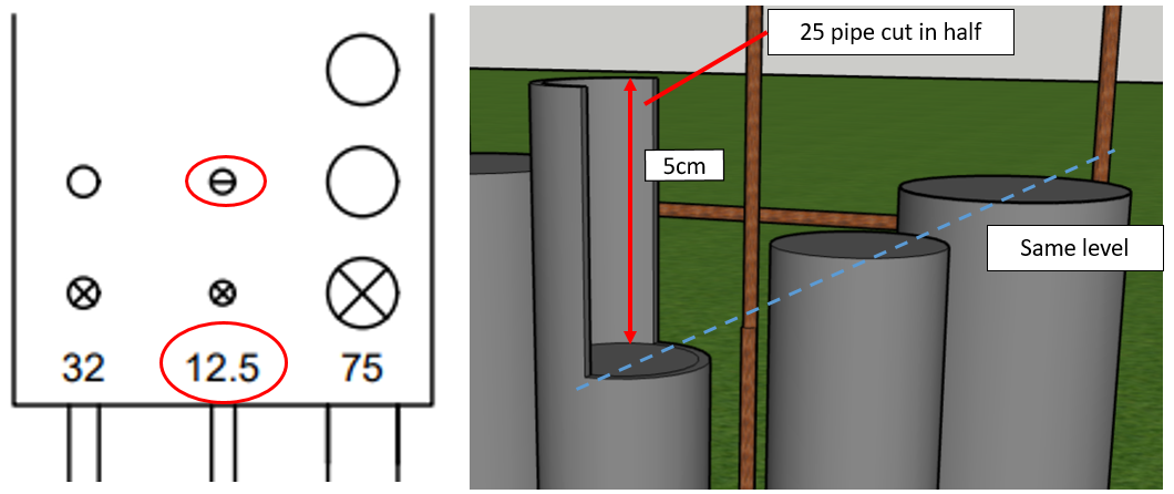 When the sketch map indicates an inlet as 12.5 or 16, this must be understood as a half pipe. 12.5 corresponds to half of 25 mm and 16 corresponds to half of 32 mm, use Ø25 and Ø32 mm pipes respectively (see the next chapter for more details). So for this example you need to prepare the following PVC pipes: 1 DN50 for the inlet, 1 DN75, 1 DN32, 1 DN25 for the outlets and always a DN75 for the overflow. On the inlet, a drainage tee have to be installed (to allow cleaning operations):