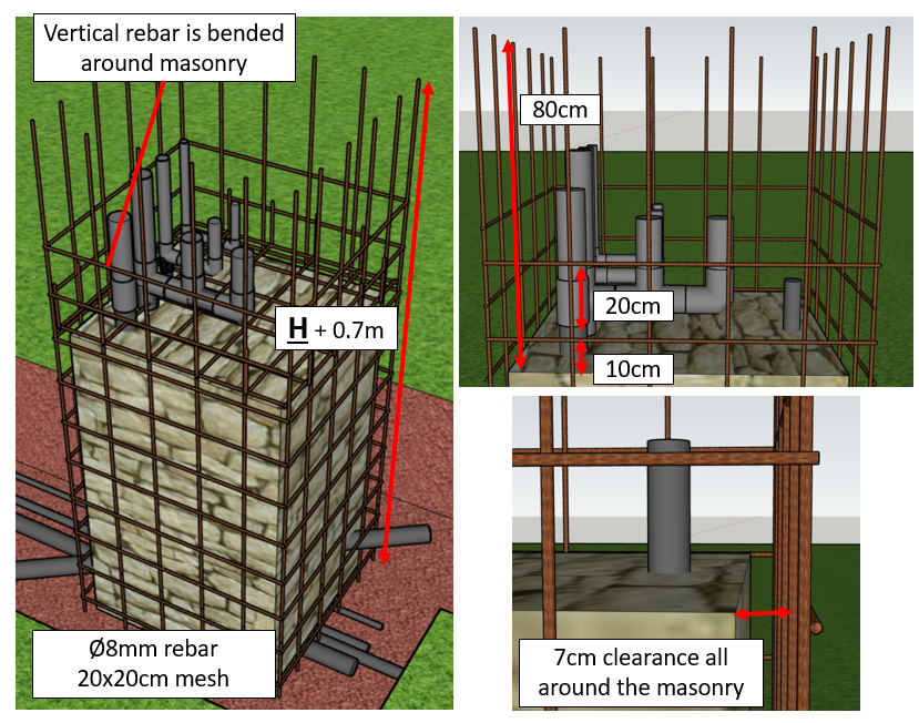 Then a masonry foundation must be built in the center of the foundation with random rubbles and 1:4 mortar. The calculated dimensions in previous chapter must be used. The pipes must be installed inside the masonry with the following dimensions (using the same example of Zaree DB):2)