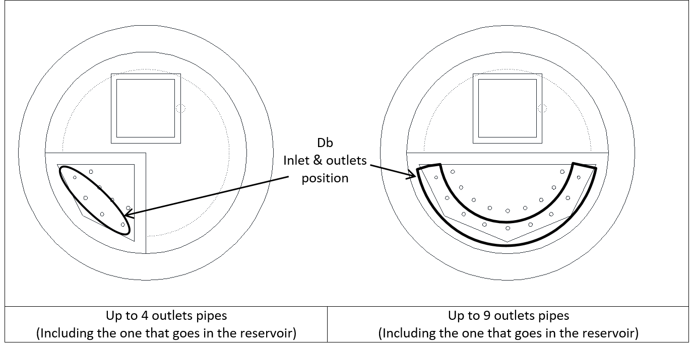 This rules are meant to position pipe on the side of the reservoir to help maintenance operations1) and DB casting. The best way to prepare is to draw a 65cm radius circle in the middle of the foundation to place inlet and outlets every 20cm. Here under an example with a double outlet, for more details on how to read DBs sketch consult Doc n° MF4-M40 “Distribution box construction methodology”: