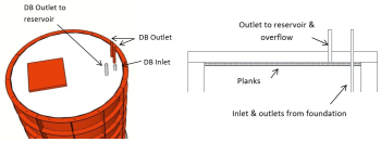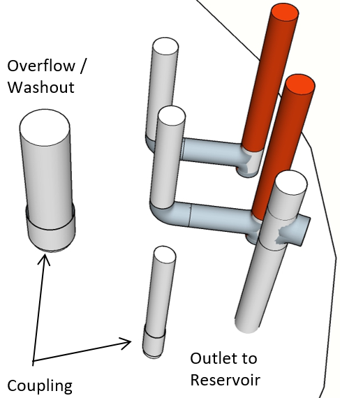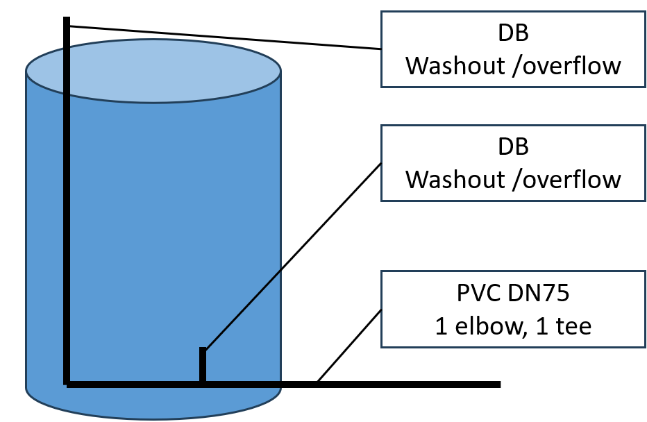 The same overflow & washout pipe is used for the DB and the reservoir as in the drawing below. Special care should be taken to positioned the pipe in the direction of the chosen drainage point.