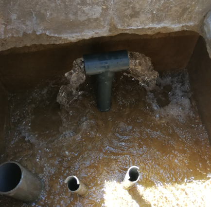 The DB inlet and outlets are made in PVC with a Tee and a drainage. The vertical pipe length is equal to the outside reservoir height (including foundations) + 50 cm (for a total of 1.9, 2.9 or 3.9m). If the DB has two connected outlets use two tees on the same horizontal pipes: