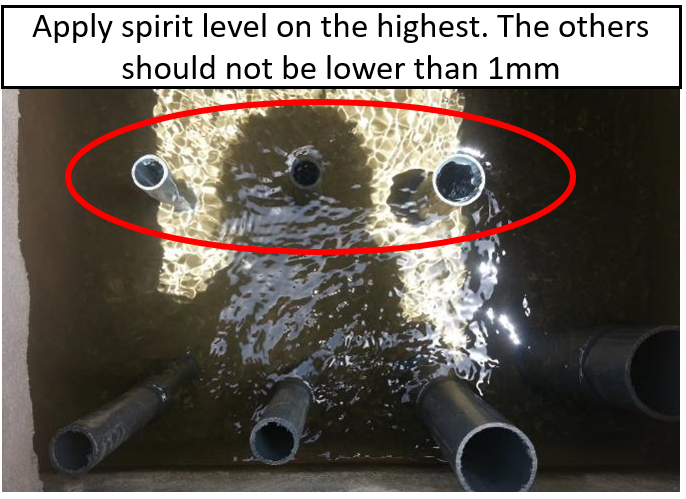 The level of all the outlets have to be checked because the accuracy of the yield repartition depend on it. Every level should be +/- 1mm the same, check using a spirit level: