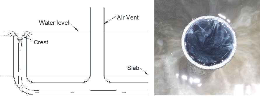 Before casting of the top slab, the PVC pipe of the reservoir outlet has to be installed as follow. If the outlet to reservoir is small (≤32mm) and the inlet flow important (>0.3l/s), it is necessary to use a supplementary Overflow / Washout ⌀75mm installed in the same way: