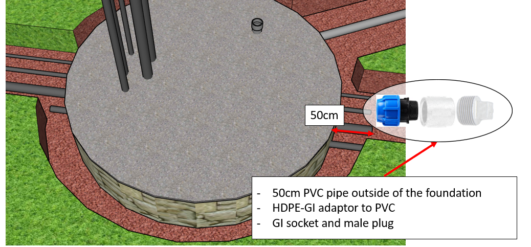 Then the foundations can be build maintaining these pipes in position. All drainages must be at least 50cm out to allow installation of the drainage maintenance assembly (See Doc n° MF4-M15 “General construction standards” § Connect PVC with HDPE fitting for a method to safely connect a HDPE fitting on a PVC pipe).