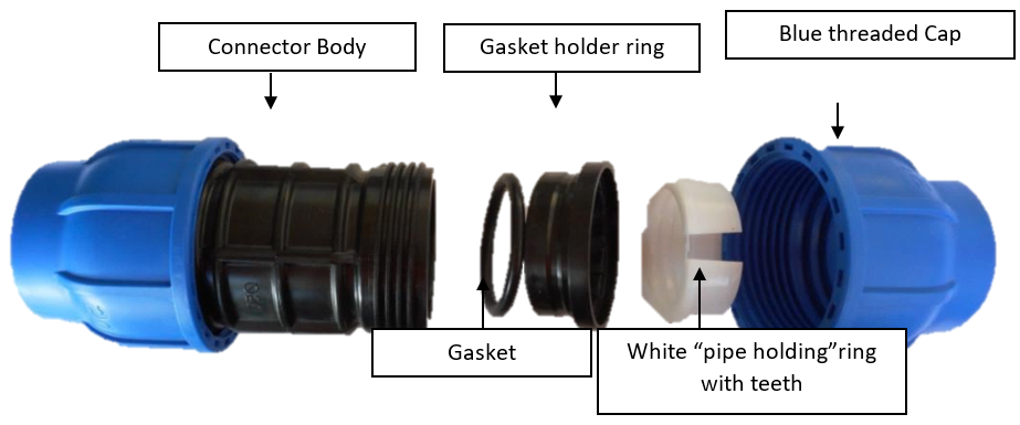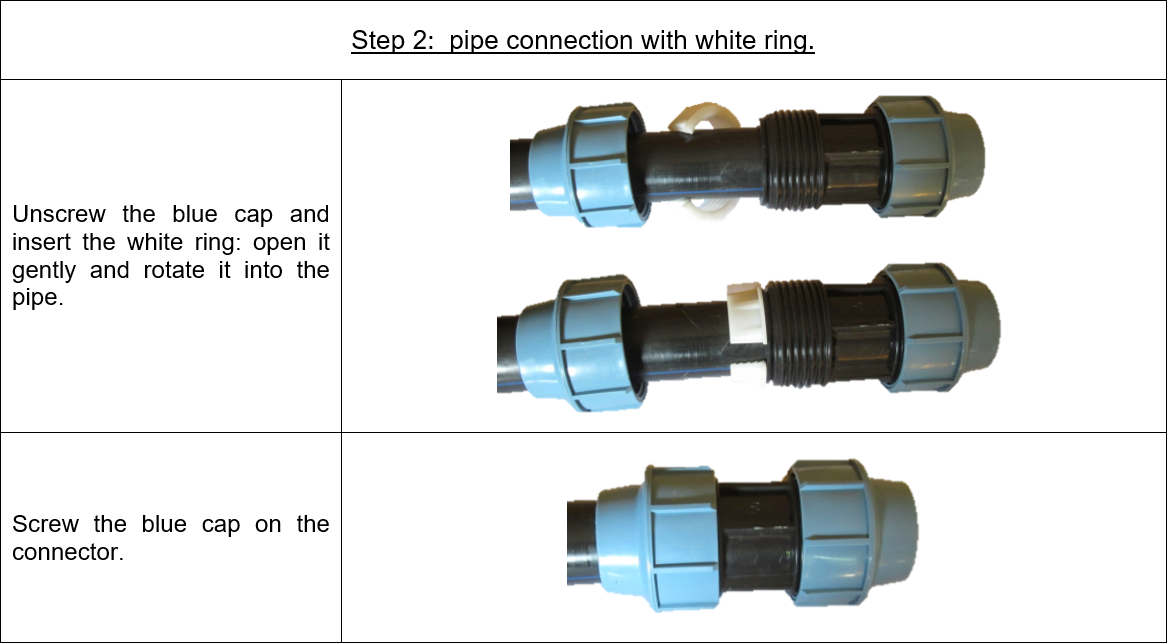 Open the connector and insert pipe through gasket, black gasket holder and white pipe holder. The pipe should be in contact on the stop of the connector body and finally the connector can be strongly tighten by hand