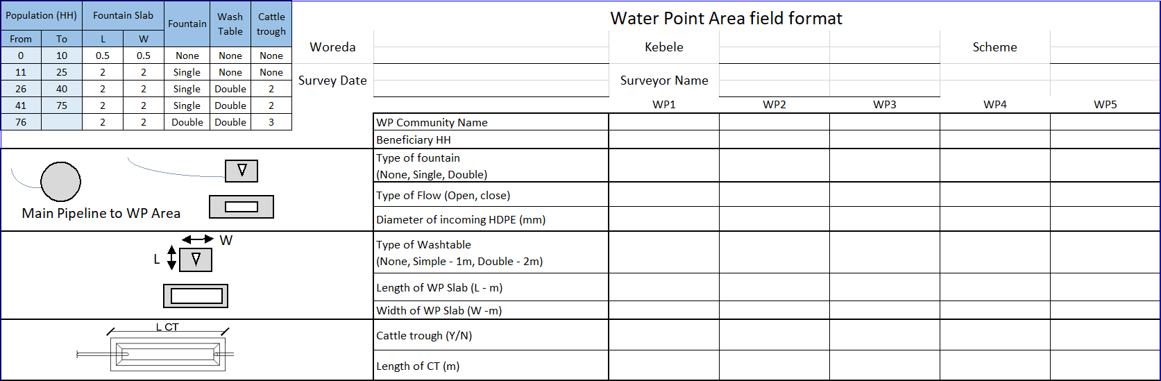 In every planned water point area, the exact position of all structures (reservoir, fountain, cattle trough, wash table) must be decided and pegged following chapters 3,4 and 5 of Doc n°MF4-M60 “Water point construction” § Orientation of overflow pipe in different scenarios. The format MF4-F62 “Water point configuration format” is filled in by the construction expert for contractual purposes and as a reminder for the construction team: