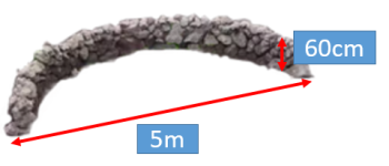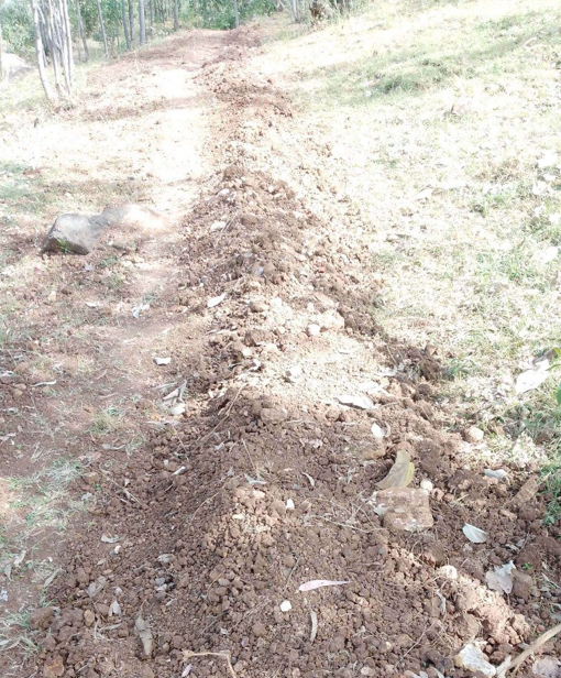 When the slope is steep (more than 20%) with no permanent vegetative covers (trees, shrubs), the trench should follow a “S” shape to decrease the slope. On each straight line, 3 half-moon shaped dry masonry walls are constructed (this construction prevents excessive erosion):