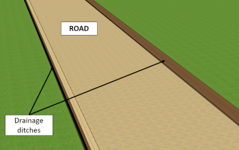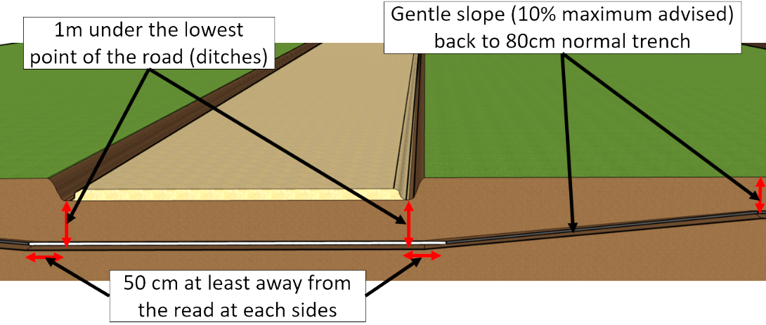 To cross a road, bury the pipe 1m under the lowest point (drainage ditch if there is). This depth must be extended to at least 50cm beyond each side of the road. As this crossing implies an over digging, it must be anticipated to avoid a sharp slope in the pipe that can cause air blocks (10% slope maximum advised). The risk of erosion must be assessed depending on the level of compaction of the road, if necessary a GI sleeve must be installed.