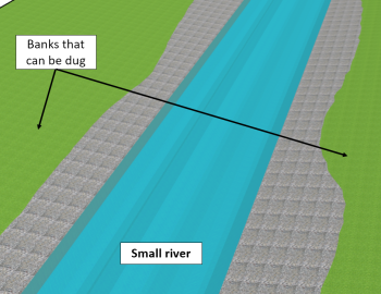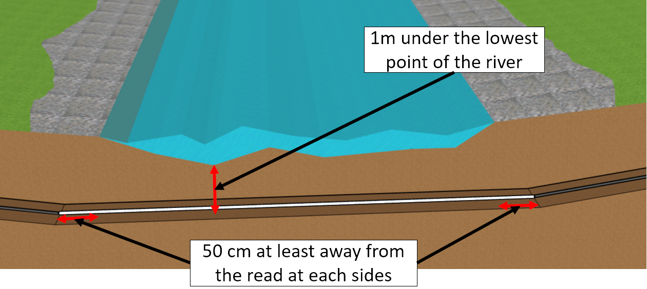 To cross a small river or a gully that is not too deep (50cm max.) and has banks that can be dug and no signs of large erosion around, the pipe should be buried 1m under the river. Same principles as road crossing should be applied: