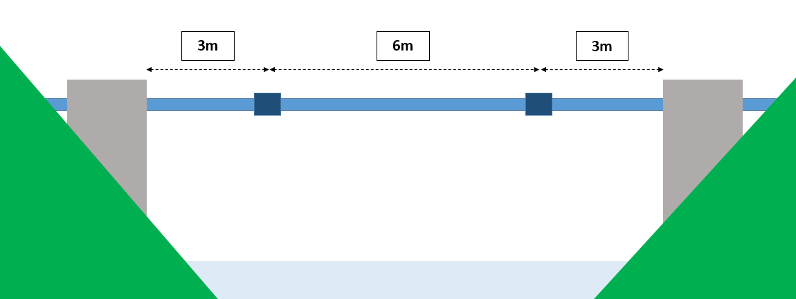 This type of crossing is limited to a 12m span, which is 2 lengths of GI pipe. If the crossing is over 6m, a 6m section of pipe must be installed in the middle with 2 sockets. This ensures the sockets are as close as possible to the concrete anchors, decreasing mechanical weakness. For example for a 12m crossing: