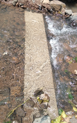 For rivers with a bed that is exposed to high erosion or that cannot be dug 50 cm deep, build a weir across the entire gully with a large spillway in the center, adapted to the rainy season flow. The pipe is buried with no sleeve upstream of the weir, 1m below the spillway.