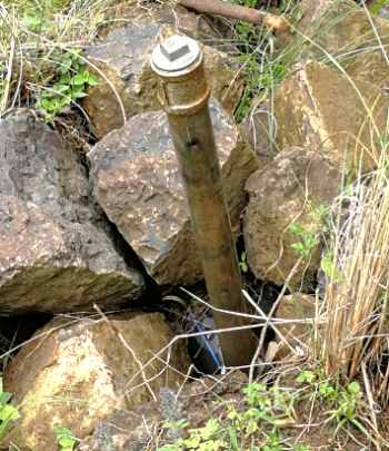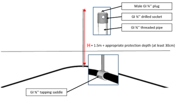 Then install a tapping saddle on the hole and connect a GI ¾’’ threaded pipe that must reach 1.5m above the ground. Drill a GI ¾’’ threaded socket at the top of the pipe to install a male plug: