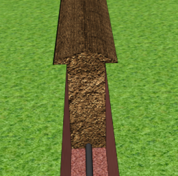 To be effective, the recommended depth for the trench is 80cm to ensure there is always minimum 60cm of natural ground protection from the top of the pipe to ground level. The width should be kept to a minimum, 30cm for one pipe, if several pipes are in the same trench, the width is the sum of the outside diameters plus 25cm. Big rocks and sharp edges must be removed from the trench to avoid damage on the pipes after the filling.