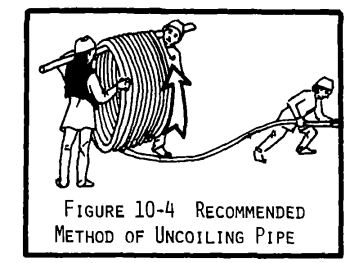 Protection should be applied during installation by taking extra care when handling coils of HDPE pipe. Deliveries must be as close as possible to the installation site because coils must be uncoiled only once (to avoid over bending) and pipes should never be dragged on the ground. Before installing the pipe, it should be carefully uncoiled while lifted up to avoid scrapping the ground. A stick can be used to that purpose: