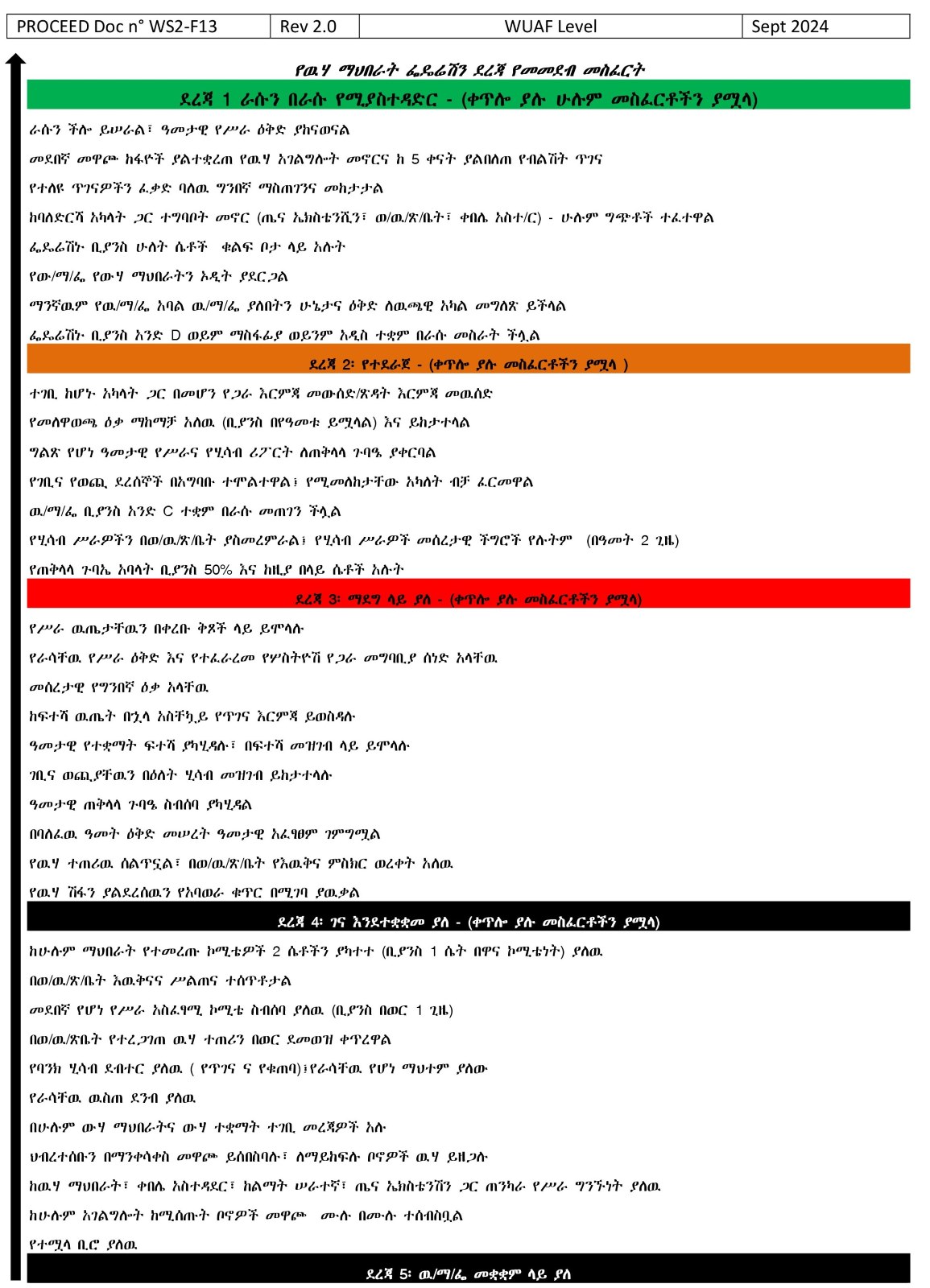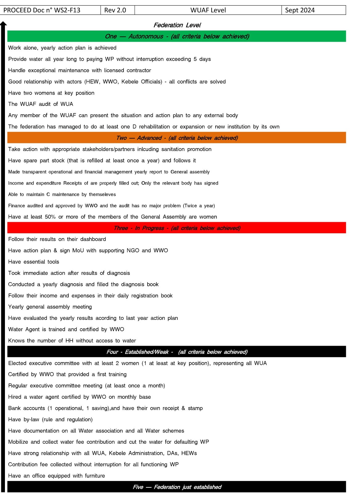 Both Language Amharic English Ws2-F11 Checklist For Wuaf Strengthening Ws2-F12 Quarterly Planning And Accomplishment Of Checklist Item Ws2-F13 Wuaf Level Ws2-F14 Water Agent Level WUAF Strengthening Sorry this methodology is still under construction. The format related to this topics can already be found by clicking on the download button. የዉሃ ማህበራት ፌዴሬሽን ደረጃ የመመደብ መስፈርት WUAF Level