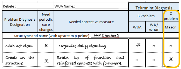 e.g. There is a pipe uncovered build a dry wall and backfill * or the need to re-organize the periodic care e.g. Water point is muddy Organisation of daily cleaning