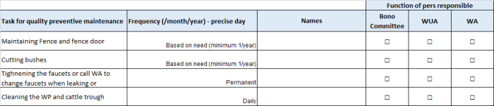 A table listing the persons responsible for each periodic care task and the frequency with which these tasks must be performed. This table must be created for each spring and WP and is written in the WUA Book.