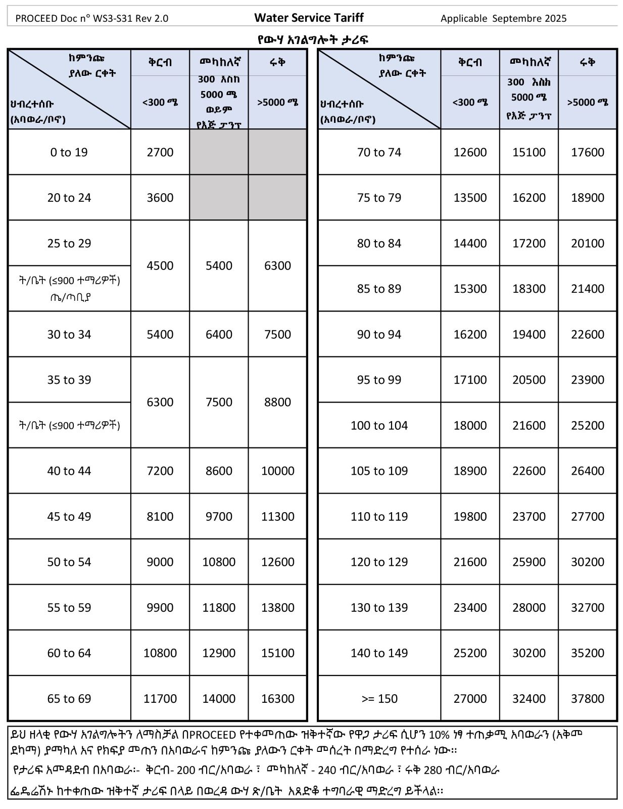 Both Language Amharic English Ws3-S31 Water Service Tariff 2018EC Ws3-F32 Water Points Lumpsum Fee List Fee Contribution Sorry this methodology is still under construction. The format related to this topics can already be found by clicking on the download button.